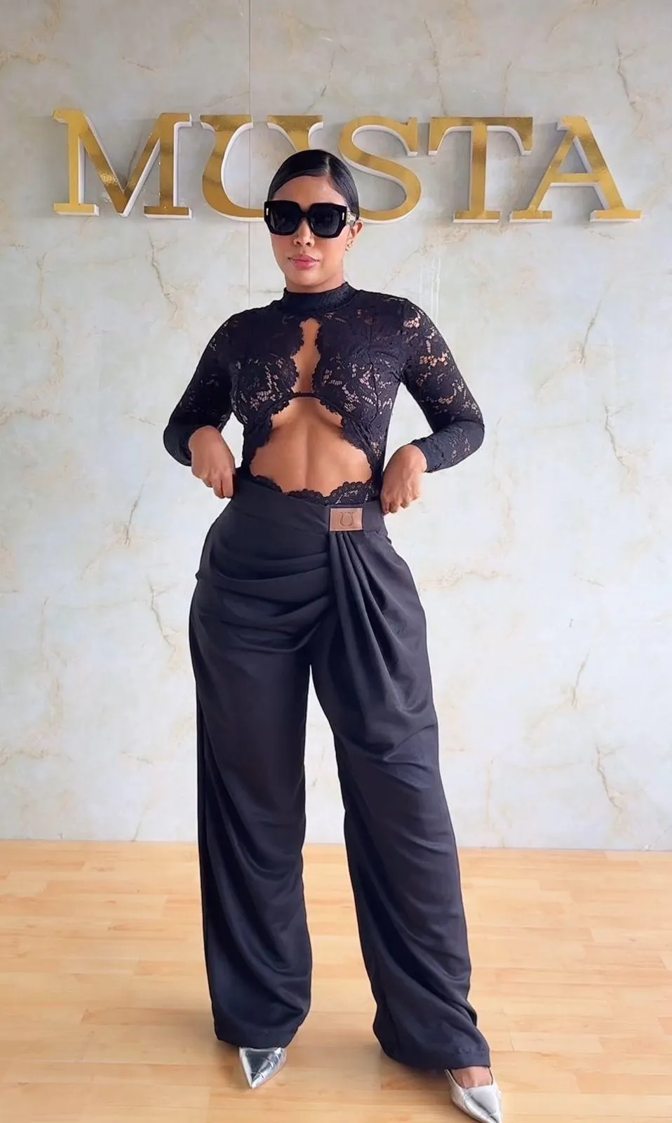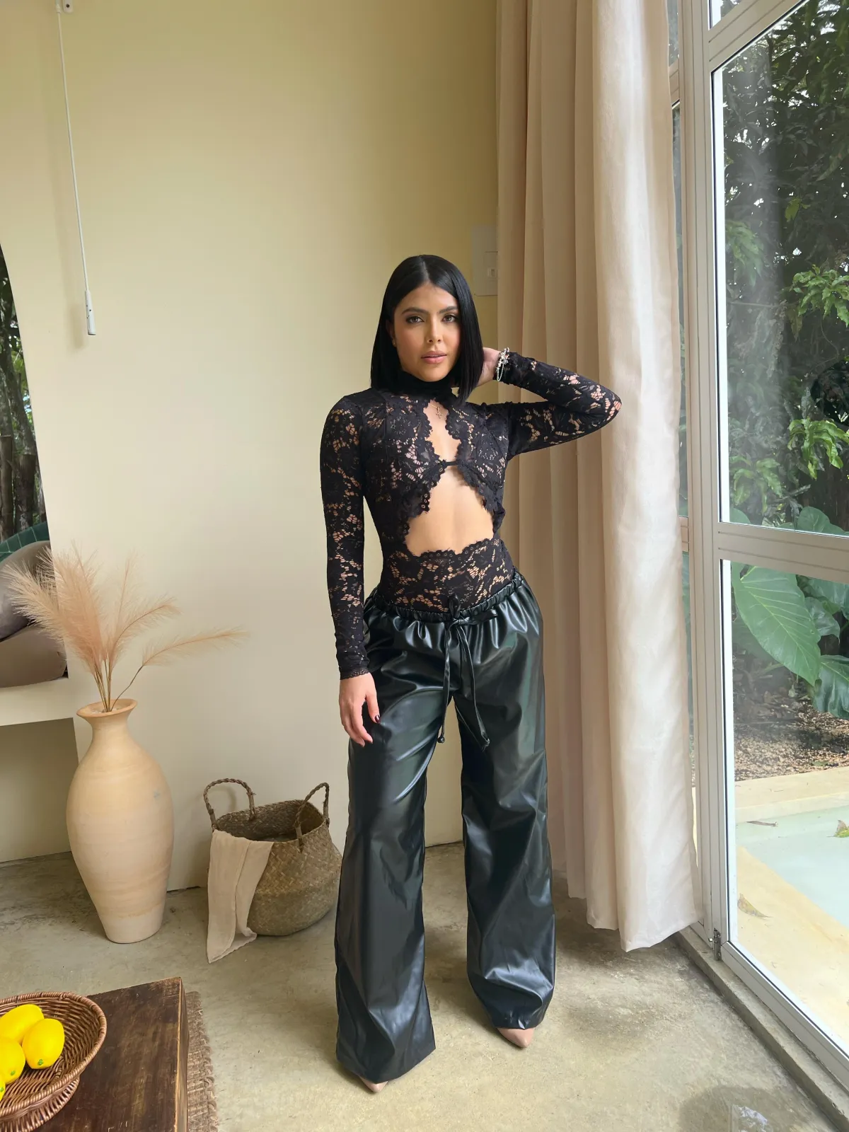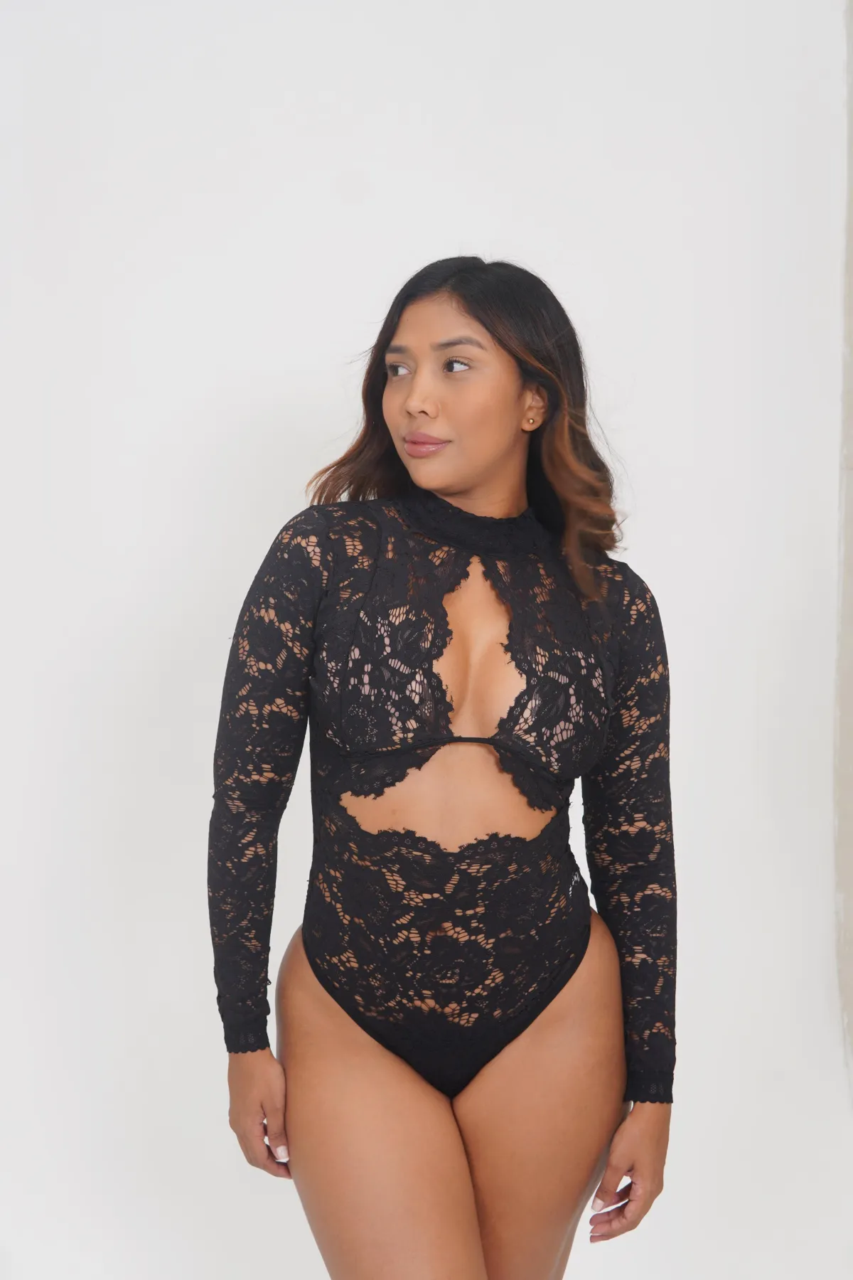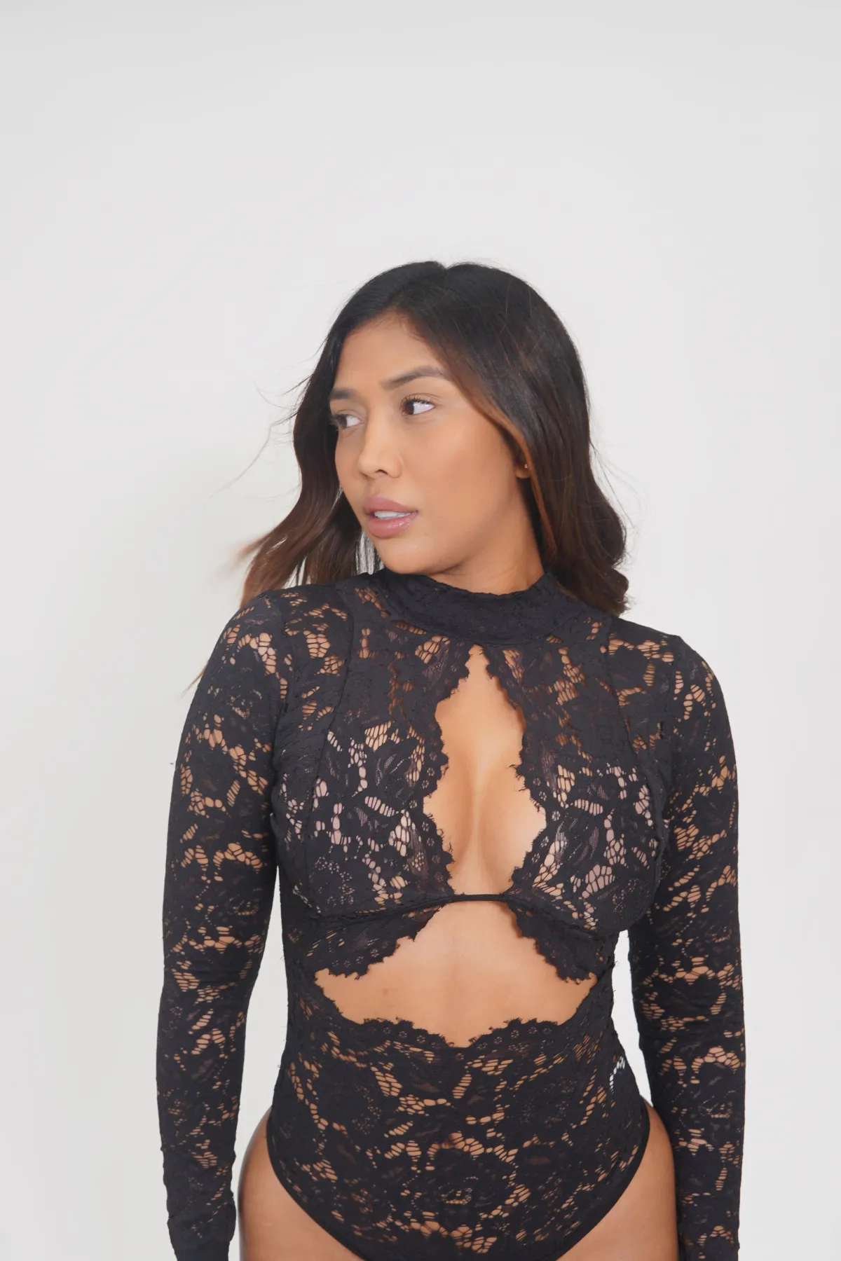 Sofisticado, sensual y delicado. Este body de encaje negro es una prenda statement que combina elegancia y fuerza femenina. Con un diseño de abertura frontal que realza la silueta de forma sutil, espalda con escote lágrima y un encaje suave de alta calidad que se adapta perfectamente al cuerpo. Ideal para ocasiones especiales, cenas, eventos o para elevar cualquier look
